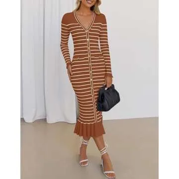 ZESICA Women's Striped Sweater Dress - Elegant Long Sleeve V Neck Bodycon Knit