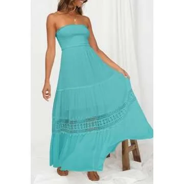Show moreIntroducing the ZESICA Women's Summer Bohemian Strapless Off Shoulder Lace Trim Backless Flowy A Line Beach Long Maxi Dress, the ultimate attire for your sun-soaked adventures and elegant gatherings. Designed for those who appreciate both style and comfort, this stunning maxi dress features a lightweight, breathable fabric that flows beautifully with your movements. The intricate lace trim enhances its charm, while the off-shoulder design allows you to showcase your graceful neckline. The elastic waist provides a tailored fit, ensuring that you look and feel your best no matter the occasion.