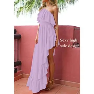 Show more Step into summer in style with the ZESICA Women's Summer Boho One Shoulder Sleeveless Ruffle Asymmetrical High Low Flowy Prom Gown Wedding Long Dress, designed for the modern woman who loves to make a statement. This stunning piece comes in a delightful purple shade and is crafted from ultra-soft, breathable fabric that ensures comfort without compromising on style. The unique one-shoulder design, paired with a charming ruffle, creates a visually appealing asymmetrical high-low hem that elegantly showcases your legs, making it a perfect choice for both formal occasions and casual outings. Available in sizes ranging from Small (US 4-6) to X-Large (US 16-18), this dress is tailored to fit like a dream, allowing you to select the size that flatters your figure best.