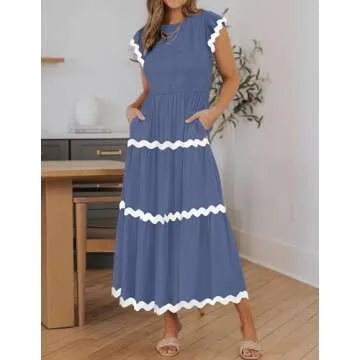 Show more The adorable smocked dress you've been searching for is finally here! This charming piece is designed with short flutter sleeves, a round neck, and a stylish elastic high waist that flatters every silhouette. Made by a reputable brand dedicated to quality and comfort, this dress features a beautiful rickrack trim design that adds a touch of elegance to your attire. The flowy A-line skirt, with its midi length, offers freedom of movement while maintaining a sophisticated look.