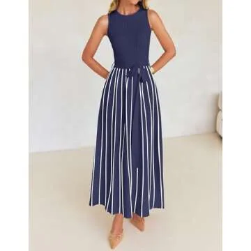 Show moreIntroducing the ZESICA Women's Summer Sleeveless Midi Dress, a perfect blend of comfort and style that elevates your summer wardrobe. With its elegant crew neck, soft and elastic fabric, and feminine fit-and-flare design, this dress is tailored for comfort without compromising elegance. Available in various sizes from S (US 4-6) to XL (US 16-18), this chic ribbed knit dress features a cute tie waist that allows for adjustable styling, ensuring a flattering fit that accentuates your shape. The eye-catching vertical stripe details and stylish flowy hem create an elongated silhouette, allowing you to embrace your soft femininity effortlessly.