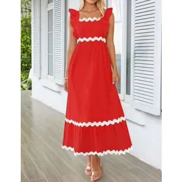 What makes this dress truly special is its functionality – with convenient pockets included, you’ll have a place to store essentials while on the go. The high waist is tailored to accentuate your curves with its elastic smocked back, while the playful rickrack trim adds just the right amount of detail. Available in vibrant colors like red, this dress is perfect for various occasions, making it a true wardrobe staple.