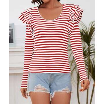 ZESICA Womens Ruffle Long Sleeve Scoop Neck Shirt Striped Slim Fitted Casual Basic Tee Tops Trendy Spring Clothes,Red,Small