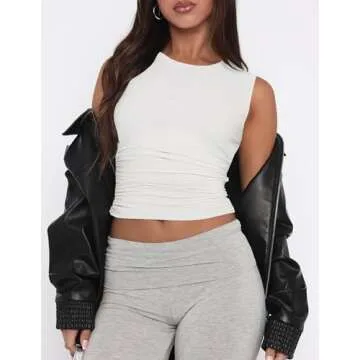 ZESICA Womens Summer Tank Tops 2025 Sleeveless Crewneck Knit Slim Fitted Side Ruched Casual Basic Shirt,White,Medium