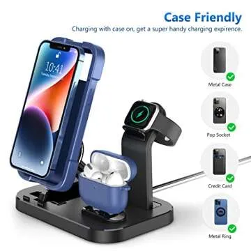 One of the standout features of the charging dock is its 120° adjustable phone holder. This means you can easily find the perfect angle for viewing or using your device while it charges, whether you use cases, pop sockets, or credit cards. Make your life easier with a gadget that allows for versatile positioning and provides effortless access to your devices while charging.
