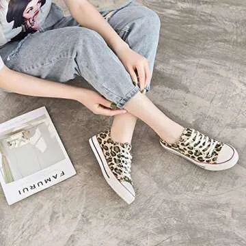 ZGR Women s Canvas Low Top Sneaker Lace-up Classic Casual Shoes Black and White (US8, Leopard)