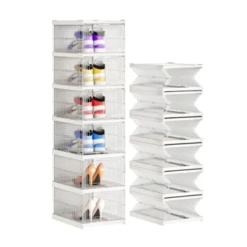 Show more Transform your shoe storage experience with the ZHAIXIAONIAN Foldable Shoe Rack, a large yet compact shoe organizer designed to elevate your closet's functionality and aesthetics. This ingenious shoe storage system comes equipped with six spacious tiers, measuring 13.58 inches in length, 10 inches in width, and 41.4 inches in height, allowing you to store up to US size 13 shoes effortlessly. The transparent, breathable design not only keeps your shoes tidy but also enables you to showcase your collection, making it a stylish addition to any space.