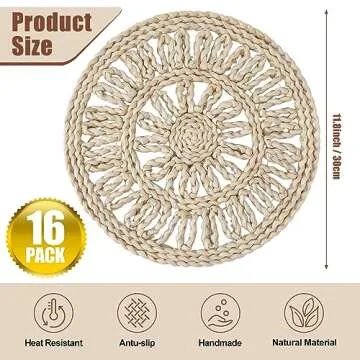 Show more Introducing the Zhehao 16 Packs Round Woven Placemats, a perfect blend of style and function designed to elevate your dining experience. Crafted from natural corn husk, these boho-inspired placemats embody durability while introducing a rustic appeal to your dining table. Measuring an ideal 11.8 inches in diameter, and 0.4 inches in thickness, they offer a sturdy base suitable for both everyday meals and special occasions. With a generous quantity of 16 pieces, you'll have enough to beautifully set your table for large gatherings, family dinners, or casual brunches while providing ample coverage for your dishes.