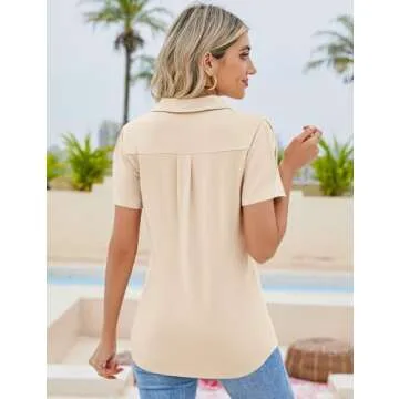 ZHENWEI Summer Collared Polo Shirt for Women - Short Sleeve V Neck Blouse with Pocket, Chic Apricot Color