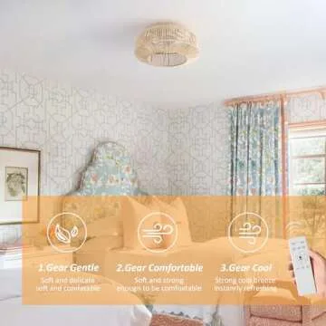 Show moreElevate your home decor with the zheshirui 20" Boho Caged Ceiling Fan with Lights, a stunning blend of functionality and style designed to enhance any space—from bedrooms to kitchens. This unique flush mount ceiling fan comes with a beautifully crafted handwoven rattan caged shade, adding a touch of bohemian elegance to your interior. Not only does it look modern and chic, but it also features an ultra-quiet, ultra-efficient design that delivers a cooling breeze. Thanks to its remote control, you can effortlessly adjust the fan's six wind speeds and set timer functions to suit your comfort all day long.
