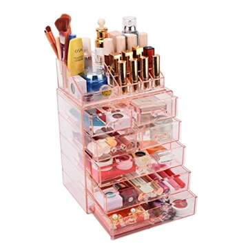 ZHIAI Cosmetic Makeup and Jewelry Storage Case Display - Spacious Design - Great for Bathroom, Dresser, Vanity and Countertop (1 Top 7 Drawers, Pink)