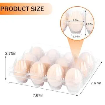 Show more Discover the ultimate solution for egg storage and presentation with our exceptional plastic egg cartons. Each package contains 100 durable plastic cartons, meticulously designed in a 3x4 cell layout, measuring at just the right dimensions of 7.8 x 5.7 x 2.8 inches. These cartons are affordable and practical, ideal for any egg producer looking to maximize efficiency while ensuring quality protection for their precious eggs.