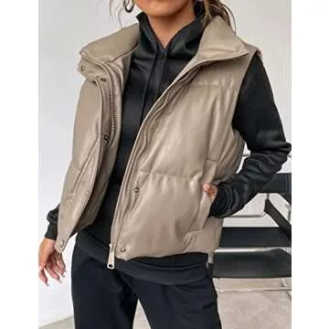 Zhiyouni Womens Faux Leather Sleeveless Puffer Vests Zipper Winter Padded Jackets Gilets (Beige-L)