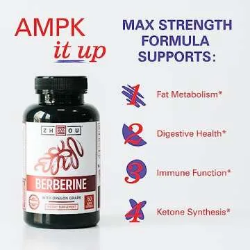 Show moreIntroducing the ultimate dietary supplement designed to revolutionize your health and wellness journey – Zhou's Berberine! This meticulously crafted product is born from a passion for quality and efficacy, ensuring that every capsule supports your body's natural processes. Activate AMPK, an essential enzyme responsible for regulating energy production, to help your body achieve optimal balance. When activated, AMPK guides your metabolic processes towards homeostasis, assisting in normalizing lipid and energy levels, which is crucial for maintaining overall health.