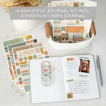 Show more Introducing the ZICOTO Ultimate All-in-One Journaling Kit, the perfect companion for anyone looking to explore the world of journaling! This beautifully curated kit is designed to inspire creativity, organization, and self-expression. Within this kit, you’ll discover a high-quality 112-page dotted bullet notebook, appealing to both seasoned journalers and beginners alike. The notebook features a stunning sage linen hardcover, complete with an elastic band and a back pocket, making it a stylish yet functional addition to your journaling experience.