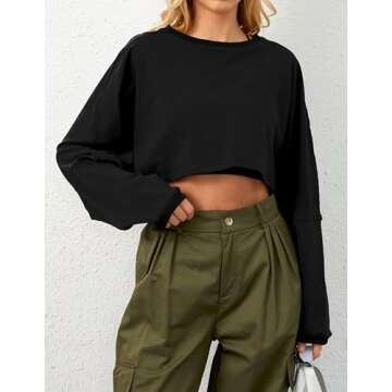 Ziesexy Cropped Sweatshirt Long Sleeve Crop Top Workout Oversized Sweatshirt Loose Crop Tops For Women Crewneck Sweatshirt Black