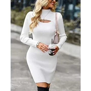 Zilcremo Women Long Sleeve Turtleneck Knit Stretch Slim Cutout Pullover Sweater Ribbed Bodycon Mini Sweater Dress White M