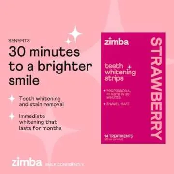 Zimba Strawberry Flavored Teeth Whitening Strips | Vegan, Enamel Safe Hydrogen Peroxide Teeth Whitener for Coffee, Wine, Tobacco, and Other Stains | 14 Day Treatment | Strawberry