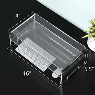 Show more Introducing the Zimilar Acrylic Monitor Stand Riser, the perfect addition to your workspace that combines style, functionality, and ergonomic design. This elegant 2-tier clear acrylic riser elevates your monitor to an ergonomic eye level of 5.5 inches, effectively reducing neck and shoulder strain. Whether you're working from home, studying, or gaming, this sleek monitor stand optimizes your workstation by saving valuable desk space while enhancing your decor.
