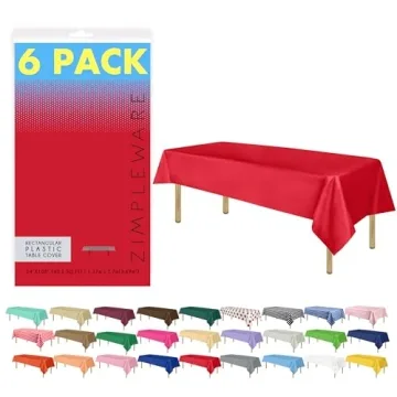 Show more Elevate your event with the Zimpleware Premium Disposable Red Plastic Tablecloths, meticulously designed to blend both luxury and practicality. Crafted from high-quality materials, these tablecloths are not only stunning but also incredibly strong, offering a fade and tear-resistant surface that withstands spills and stains with ease. Measuring a generous 54" x 108", they are perfectly suited for covering tables up to 8 feet long, making them an essential addition to any gathering or celebration.