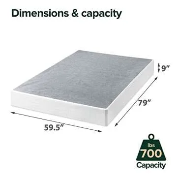 Show moreIntroducing the ultimate solution to your bedding needs—the ZINUS 9 Inch Metal Smart Box Spring. Say goodbye to the cumbersome and heavy wooden frames of the past! Engineered from robust, solid steel, this innovative foundation allows you to spend more time enjoying your rest and less time struggling with assembly. Imagine a strong, reliable box spring that assembles in a mere 15 minutes without any tools. Featuring a sleek, modern design, the ZINUS box spring not only offers functionality but also elevates your bedroom decor, thanks to its minimalistic aesthetic that fits seamlessly with any style.