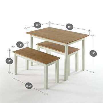 Show moreIntroducing the ZINUS Becky Farmhouse Dining Table with Two Benches, a beautiful embodiment of rustic charm designed to elevate your dining experience. This exquisite 3-piece set features a stunning two-tone painted finish on premium pine wood, allowing it to fit seamlessly into any country-style decor. With dimensions of 45 inches for the table and 36.2 inches for the benches, it offers ample space without overwhelming your dining area. The low-maintenance materials ensure you can enjoy your meals without the stress of upkeep, while the solid construction guarantees durability for years to come.