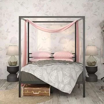 Show more Transform your bedroom into a serene oasis with this elegantly crafted canopy bed frame, designed to offer both style and functionality without breaking the bank. Made by a reputable brand, the frame boasts a striking matte finish and bold lines, making it the perfect centerpiece for any modern bedroom. Not only does it enhance the aesthetic of your space, but the solid steel construction ensures durability and longevity, making it an investment you won't regret.