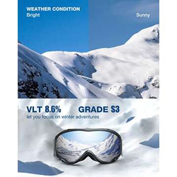 ZIONOR Lagopus Ski Snowboard Goggles UV Protection Anti fog Snow Goggles for Men Women Adult Youth VLT 8.6% Black Frame Silver Lens