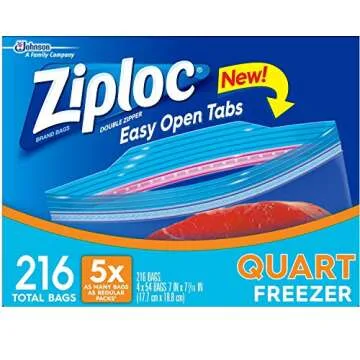 Show moreIntroducing the ultimate solution for food preservation, the Ziploc Freezer Bags! These bags are meticulously designed to provide an unparalleled experience for all your freezing needs. Sturdy and reliable, each box contains 54 durable bags, totaling a remarkable 216 bags, ensuring that you have a long-lasting supply for all your food storage needs. With Ziploc's trusted protection, your favorite garden veggies, meats, and leftovers will remain fresh longer, without the risk of freezer burn.