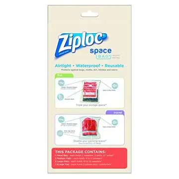 Show moreTransform your cluttered closet into an organized haven with the Ziploc Space Bag Clothes Vacuum Sealer Storage Bags. Specifically designed for home and closet organization, these innovative storage bags come in a variety of sizes (M, L, XL, and Suitcase) to suit your diverse storage needs. Crafted by a trusted brand, this solution is perfect for anyone looking to maximize their storage space without compromising the integrity of their clothing or other belongings. Each bag can reduce volume by up to 75%, effectively tripling your storage capacity. Imagine stuffing away bulky winter jackets and comforters effortlessly with this remarkable product!