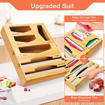 Ziplock Bag Organizer,Upgraded 6 in 1 Foil and Plastic Wrap Organizer,Bamboo Storage Organizer for Gallon,Quart,Sandwich & Snack Bag,Foil Dispenser With Cutter Fit 12" Plastic Wrap,Aluminum Foil