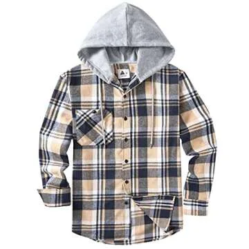 Show more This exquisite men's plaid hoodie shirt redefines comfort and style. Crafted with premium quality flannel fabric, it is not just soft and breathable, but also designed for a relaxed yet fashionable experience. The modern styling features a drawstring hood and a classic button-down closure, making it an essential piece for any wardrobe. The attractive plaid pattern adds a dash of character, while the practical utility chest pocket enhances its functionality.