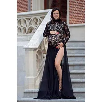 Show more Experience the elegance and style of the ZIUMUDY Long Sleeve Lace See-Through Maternity Gown, a breathtaking choice designed specifically for expectant mothers. This beautiful maternity outfit combines a stunning lace bodysuit with a flowing chiffon skirt, making it perfect for those precious maternity photoshoots. With a composition of 65% fabric and 35% spandex, this gown offers a delightful blend of comfort and flexibility that complements your beautiful curves as you bloom.