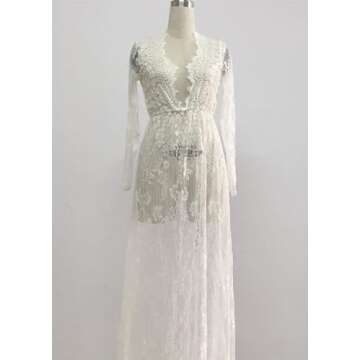 ZIUMUDY Sexy Deep V-Neck Long Sleeve Lace Beach See-Through Maternity Maxi Dress (Small, White)