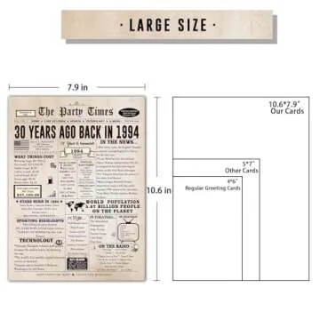 Show moreCelebrate a milestone birthday in style with the Ziwenhu Vintage 30th Birthday Card, an exceptional blend of nostalgia and humor designed for both men and women. This stunning card, measuring an impressive 7.9 x 10.6 inches, features a beautifully crafted vintage newspaper design that takes a trip down memory lane, highlighting significant events, blockbuster films, and iconic sports happenings from three decades ago. It's not just a card; it’s a keepsake that captures the essence of turning 30, making it a perfect gift for husbands, wives, dads, or moms. Notably, the card is printed on premium-quality 300gsm linen stock, ensuring that it feels as luxurious as it looks, while being eco-friendly and recyclable to boot.