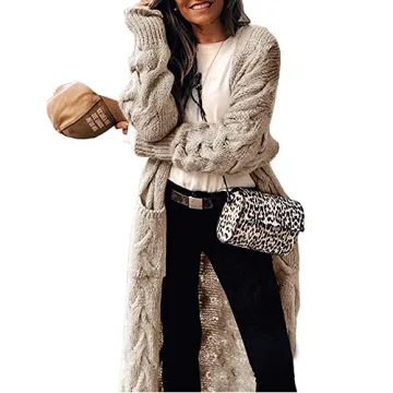 ZIWOCH Women's Long Cardigan Coats Cable Knit Casual Open Front Long Sleeve Sweater with Pockets Beige