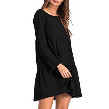 ZJCT Womens Long Sleeve Loose Dress Round Neck Pleated Swing Casual Dresses Black L