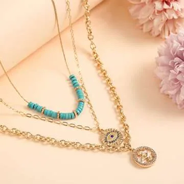Show moreDiscover the beauty of the ZMNNOPPAB 3PCS Evil Eye Gold Turquoise Jewelry Necklace Set, a perfect blend of elegance and cultural symbolism. This exquisite jewelry set features three stunning layered necklaces that capture the essence of style and protection. The standout evil eye charm is beautifully encrusted with turquoise accents, acting as a powerful talisman to ward off negativity while adding a pop of color to your outfit. Each necklace is crafted from high-quality alloy, ensuring durability without compromising on design. Perfectly packaged in a luxurious gift box, this set is not only a treat for yourself but also an ideal gift for loved ones.
