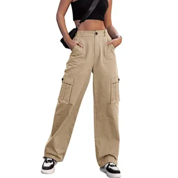 ZMPSIISA Women High Waisted Cargo Pants Wide Leg Casual Pants 6 Pockets Combat Military Trousers(Khaki,Medium)