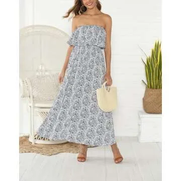 Show more Transform your summer wardrobe with this stunning off-shoulder maxi sundress crafted from a luxurious blend of 95% rayon and 5% spandex. Experience the ultimate in comfort with a soft, lightweight, and breathable fabric that promises to keep you feeling cool during those hot sunny days. This dress features a beautiful layered design with a strapless ruffle bust, ensuring that you stay stylish without sacrificing comfort. The vintage floral print adds a touch of bohemian charm, perfect for capturing the essence of summer.