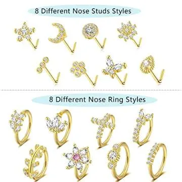ZNBOH 16Pcs 20G Stainless Steel Nose Rings Hoop for Women Men Paved CZ Cartilage Earring Hoop Cute Butterfly Flower Nose Piercing Jewelry Gold Black Rose Gold