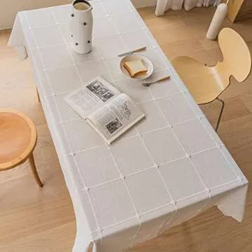 Show more Introducing the Zobesta Linen Table Cloth, a perfect blend of elegance and functionality, meticulously crafted from high-quality cotton linen and polyester. This heavyweight tablecloth is designed not only to elevate your dining experience but also to provide superior strength and durability for everyday use. With its chic white grid pattern, it effortlessly complements both rectangular and square tables, making it a versatile addition to any home decor.