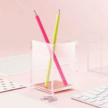 Show moreIntroducing the Zodaca Deluxe Acrylic Design Soft Touch Square Pen Pencil Ruler Brush Holder Cup, a stylish and versatile desktop accessory that combines elegance with functionality. Designed with a sleek clear finish and stunning rose gold accents, this organizer is not just a practical addition to your workspace, but also a beautiful piece that enhances your decor. Measuring at a perfect 2.75 inches square, it fits comfortably on your desk yet offers ample space to neatly arrange a variety of items including pens, pencils, rulers, and brushes. Whether it's your office, study area, or makeup vanity, this multifunctional holder meets your needs while keeping clutter at bay.