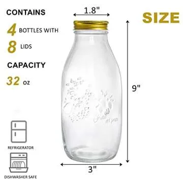 Show more If you are in search of the perfect gift for the eco-conscious individual or a cooking enthusiast, look no further than the ZOOFOX Square Glass Milk Bottles. This premium package includes four stylish 32-ounce glass milk bottles, complemented by eight stunning gold metal caps. The unique square design allows for excellent space-saving capabilities, making fridge storage not just efficient but visually appealing as well.