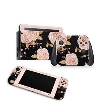 ZOOMHITSKINS Compatible with Switch Skin Cover Soft Gold Flowers Rose Golden Black Leaves Pink Coral Pastel CLassic Vintage 3M Vinyl Decal Sticker Wrap, Made in The USA