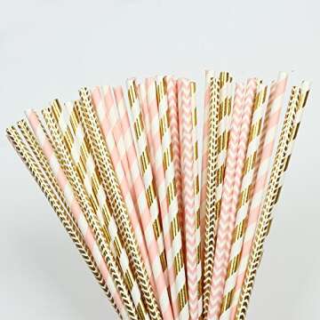 ZOOYOO Paper Straw 100pc For Parties,Birthdays,Weddings,Baby Showers And Celebrations (Pink/Gold)