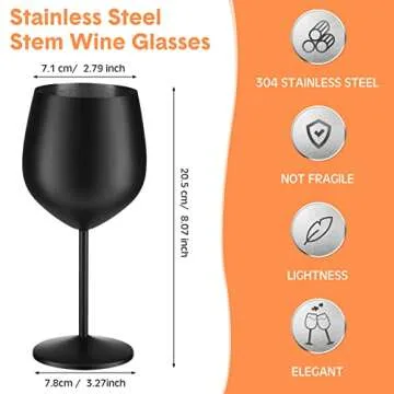 Show more Introducing the ultimate blend of elegance and durability: our 18 oz stainless steel wine goblets. Designed with sophistication in mind, these stunning matte black goblets are not just another addition to your barware collection—they're a statement piece. Perfect for a variety of beverages, from fine wine to cocktails, they effortlessly elevate your everyday drinking experience. Each goblet measures approximately 8.07 inches in height and 2.8 inches in width, boasting a generous 18 oz capacity that fits all your favorite drinks.