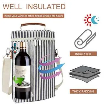 Show moreIntroducing the ZORMY 2 Bottle Wine Tote Carrier, your ultimate companion for both casual outings and elegant gatherings. Crafted from high-quality 600D polyester, this stylish dark blue tote not only boasts durability but also features maxcold insulation that keeps your wines at the ideal temperature. Measuring 8.3" x 3.8" x 13", it can comfortably fit two standard 750ml bottles of wine or champagne, as well as multiple beer crowlers and a growler. Its intelligent design includes a self-storing corkscrew, ensuring you have everything you need for an impromptu toast or a leisurely picnic.