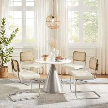 Show more Introducing the Zouron Mid-Century Modern Dining Chairs, a perfect blend of style and comfort that brings a touch of contemporary elegance to any space. Crafted to elevate your dining experience, these chairs feature a unique combination of high-quality materials, including a breathable hand-woven rattan back, a plush PU leather seat, and robust chrome-plated metal legs. Designed for maximum versatility, they seamlessly fit into various decor styles—from kitchens and dining areas to living rooms and patios—making them an ideal choice for both everyday use and entertaining guests.
