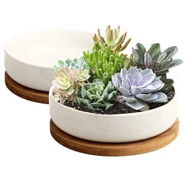 ZOUTOG Succulent Pots, 6 inch White Ceramic Flower Planter Pot with Bamboo Tray, Pack of 2 - Plants Not Included